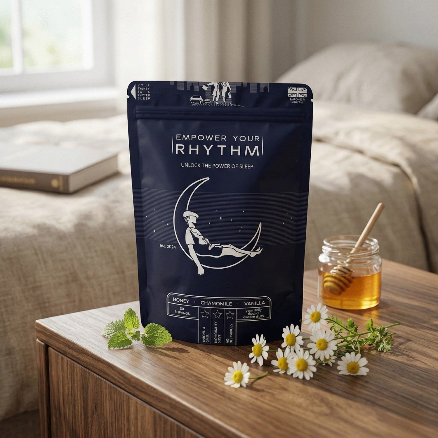 Chamomile, lemon balm, glycine, magnesium bisglycinate, apigenin, and essential nutrients work together to support relaxation, sleep quality, and balanced morning energy.